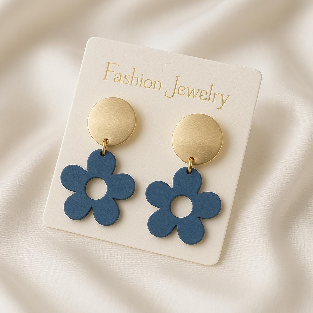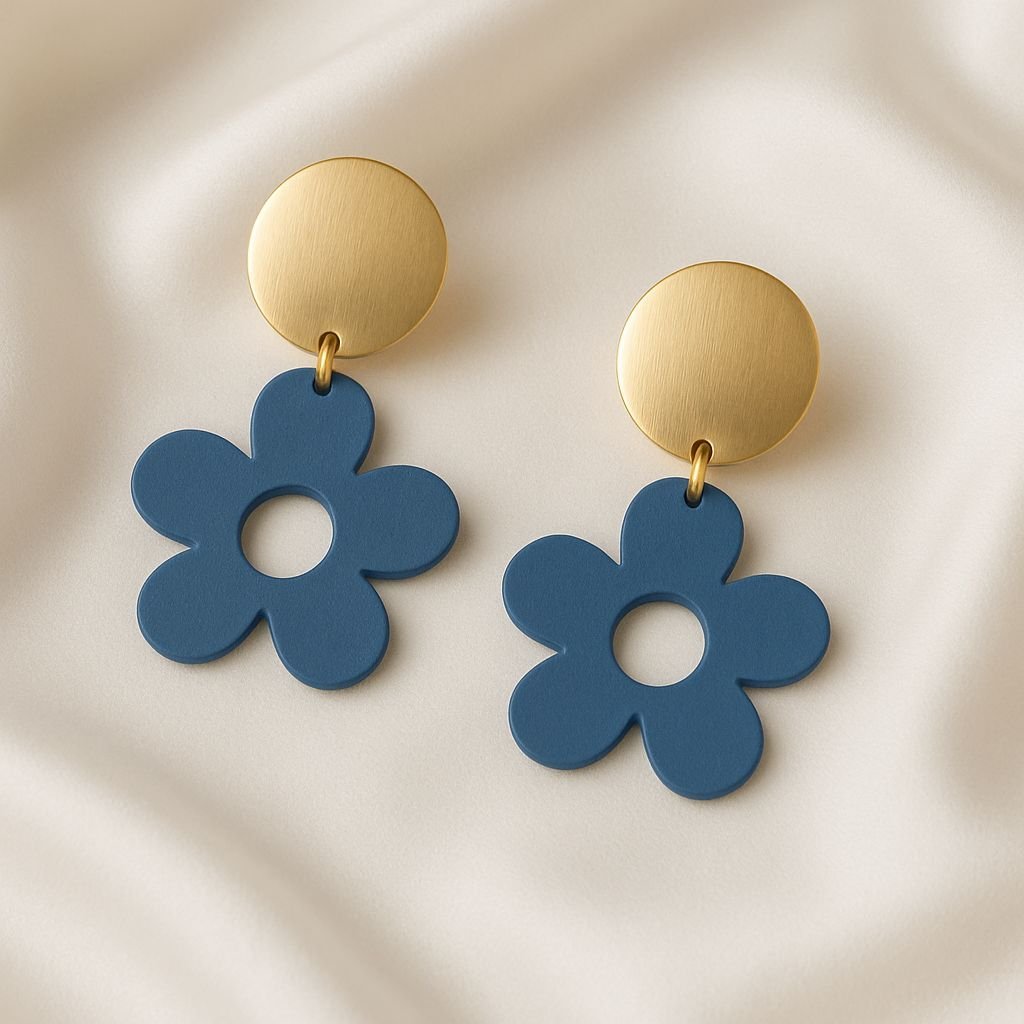 Featuring a soft matte blue floral motif suspended from a round gold-plated top, this lightweight pair complements both casual and party looks effortlessly.
