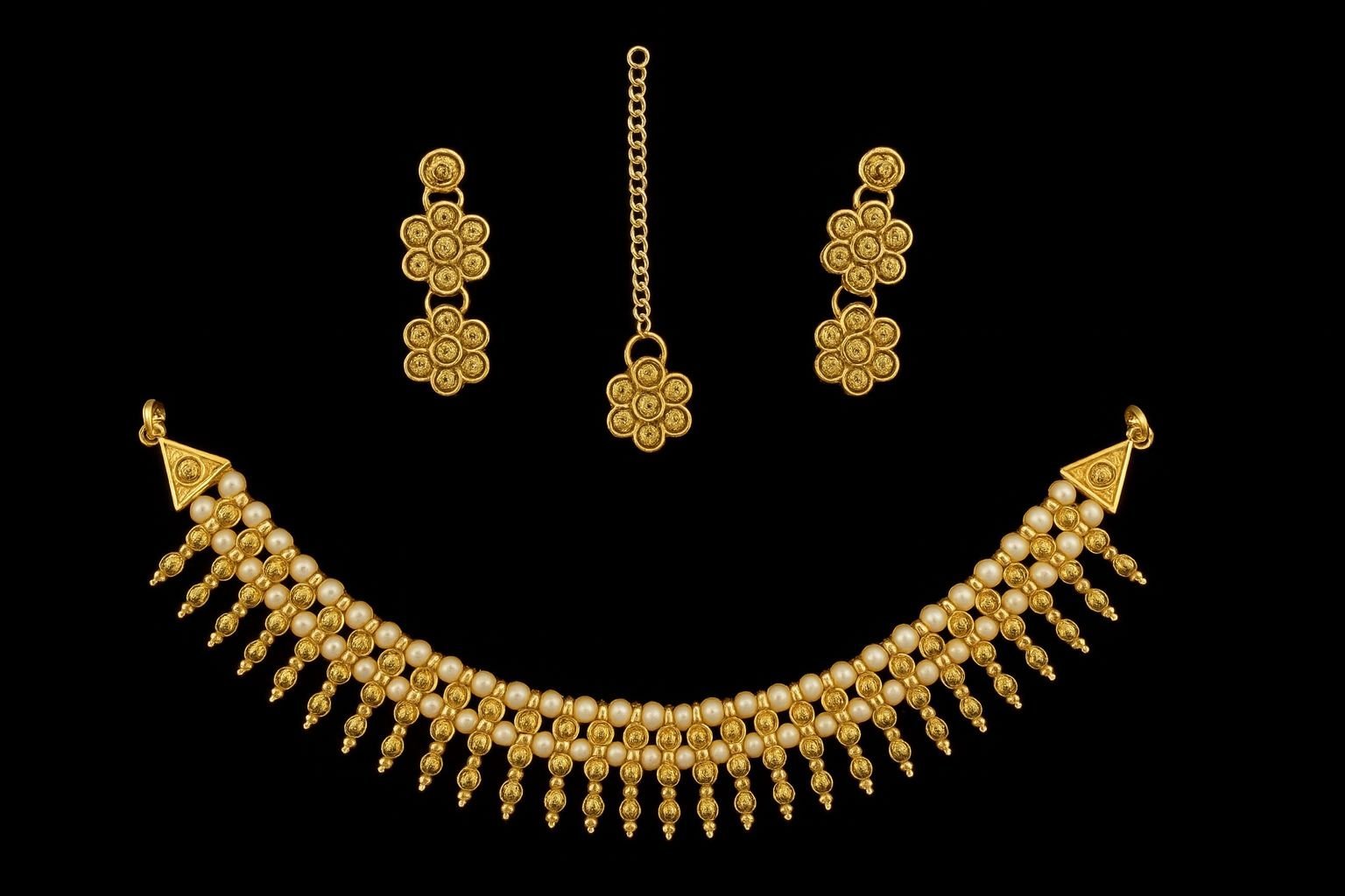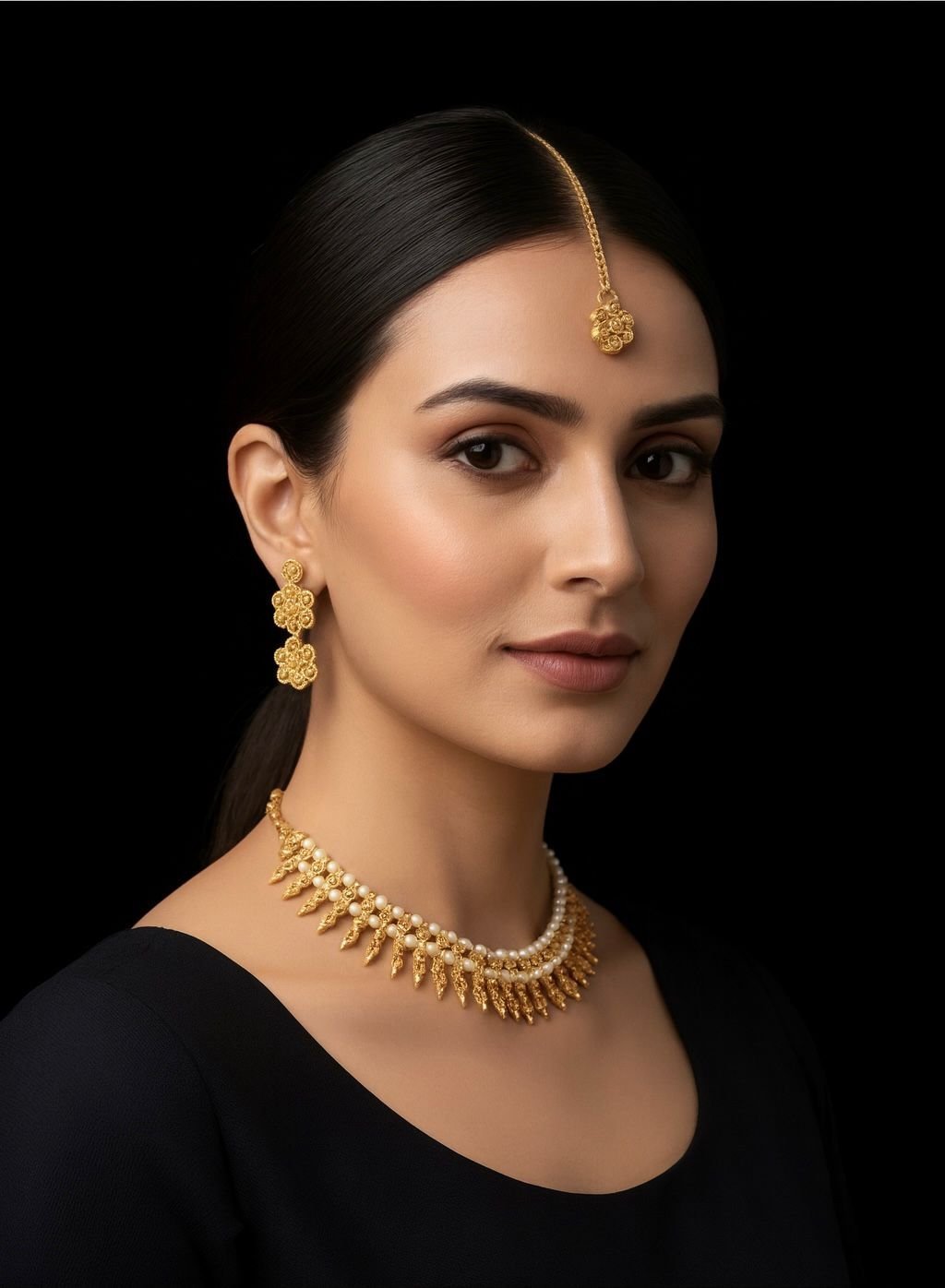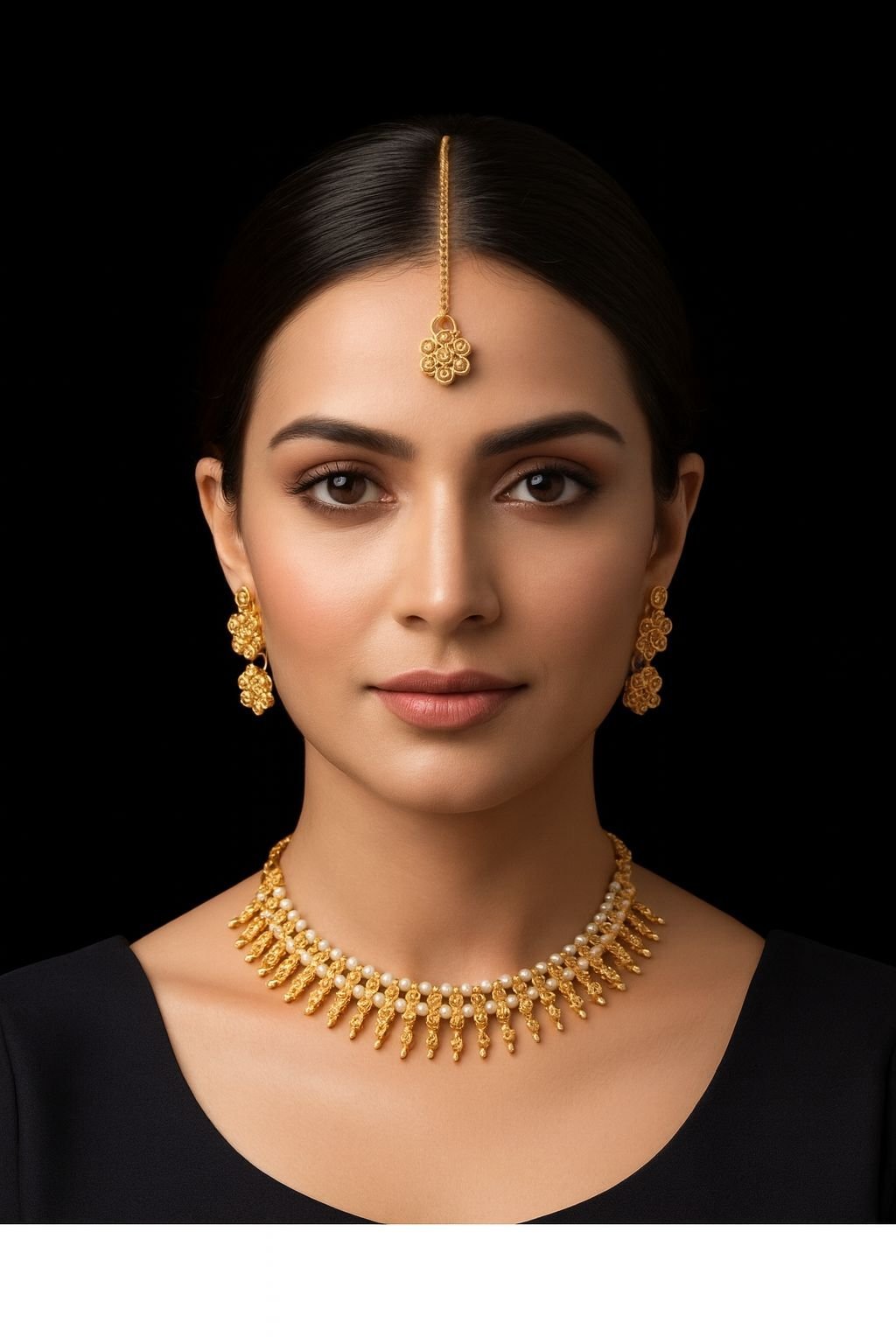 This handcrafted set includes a traditional necklace, matching earrings, and a beautiful maang tikka, all adorned with intricate detailing and delicate pearl accents.