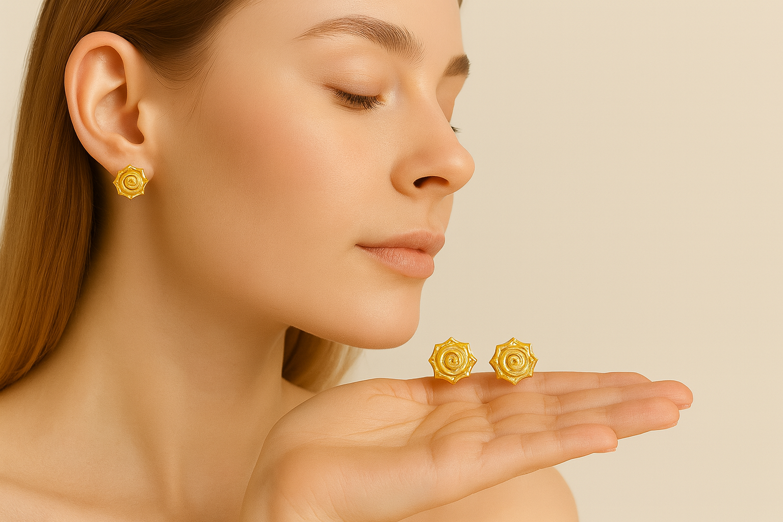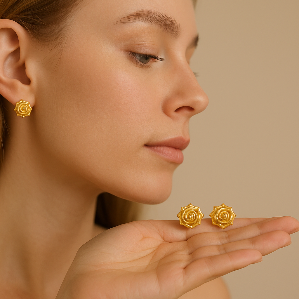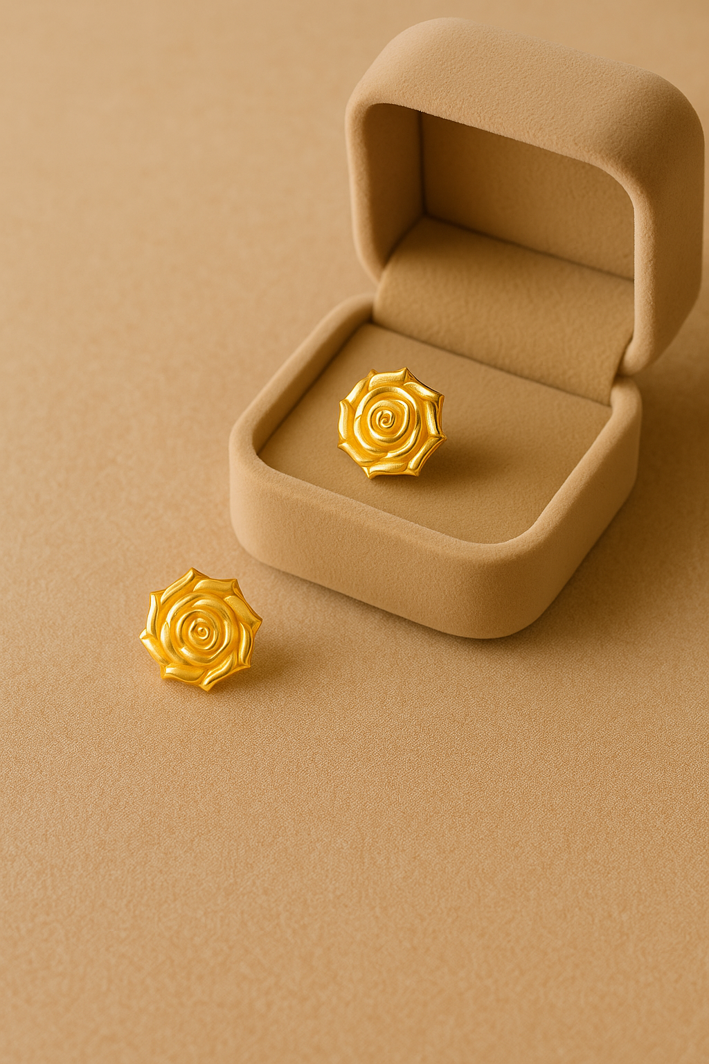Each earring features a floral spiral motif inspired by blooming roses, finished with a rich matte gold polish that gives a premium yet natural glow.