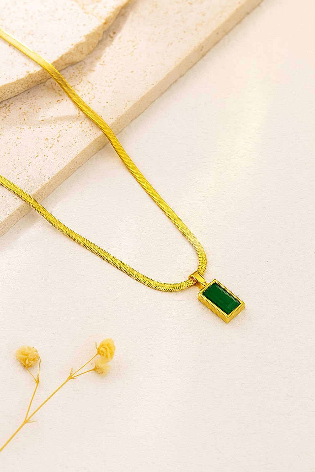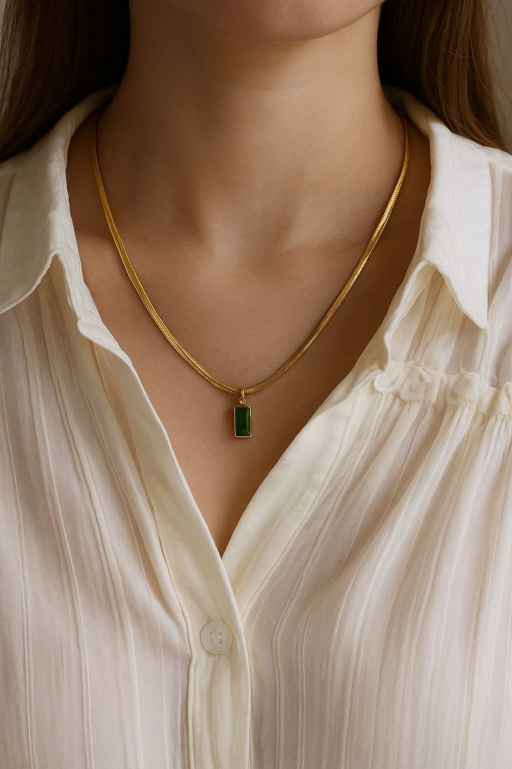 Crafted to perfection, this necklace features a rectangular green gemstone that adds a subtle yet striking glow to your neckline. The delicate gold-plated chain complements both ethnic and modern outfits effortlessly.