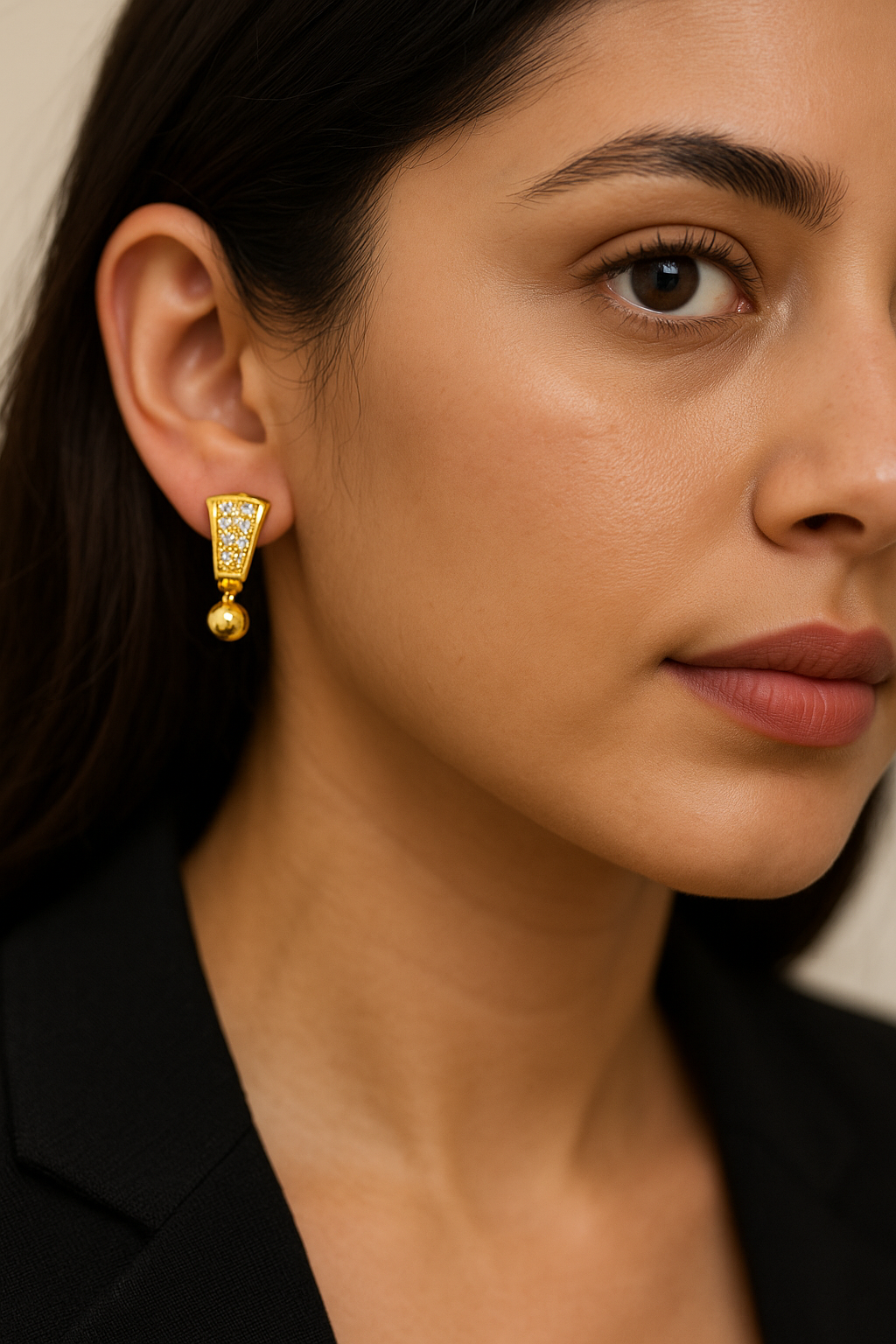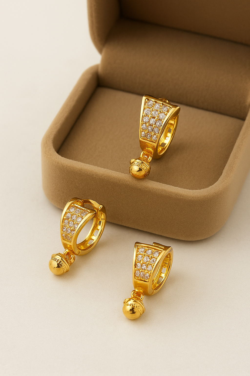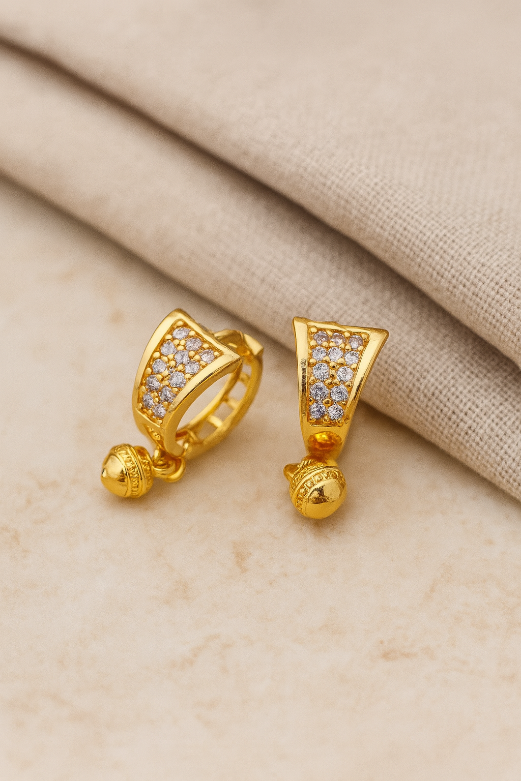 Each earring features pave-set CZ crystals on a gold-plated hoop, finished with a delicate mini jhumka bell drop that adds graceful movement.