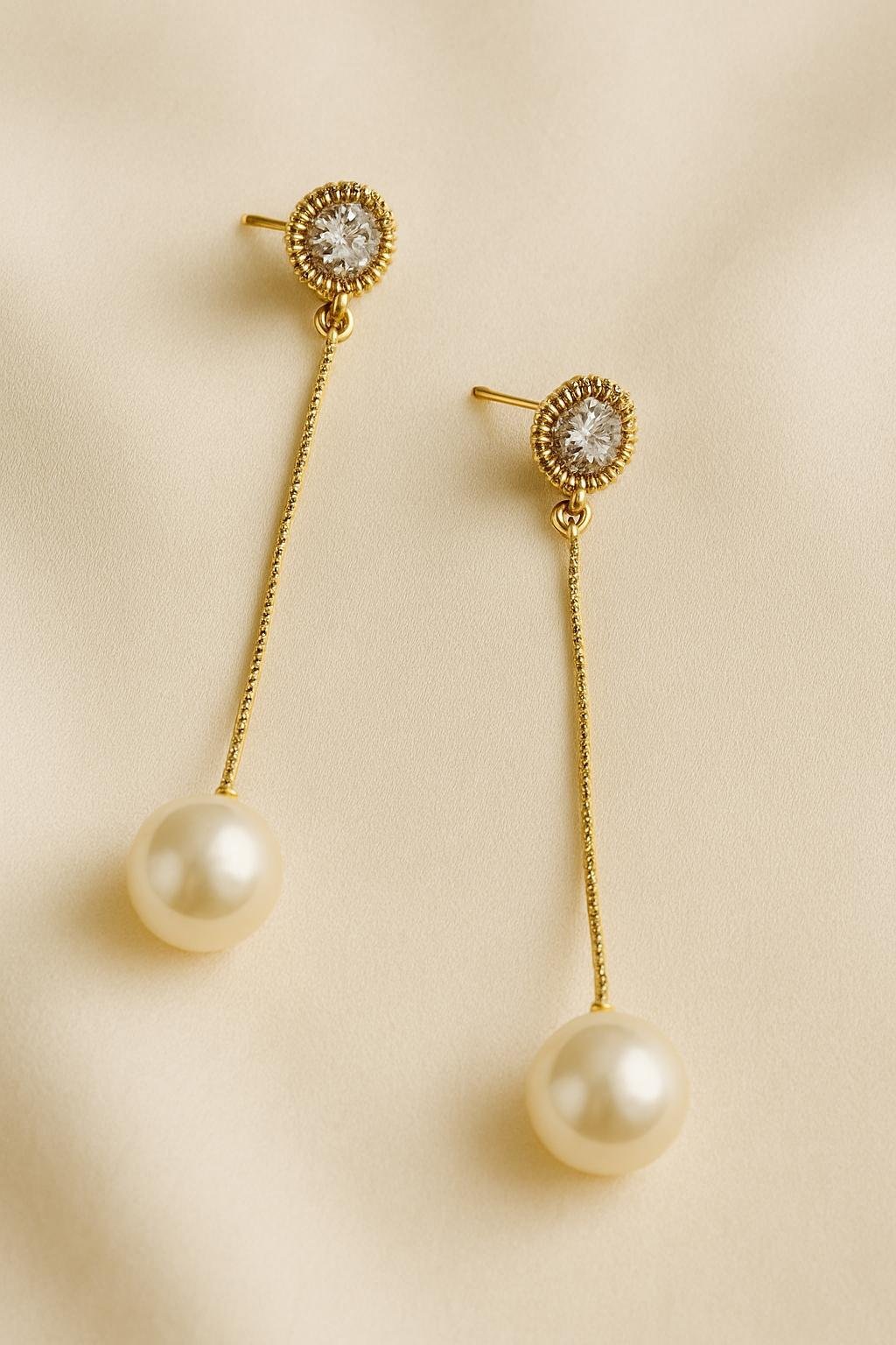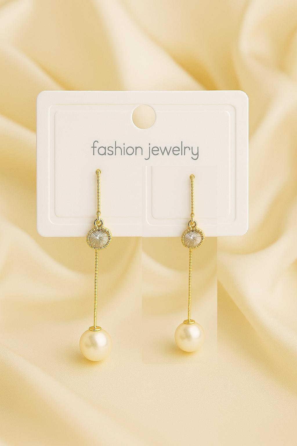Each earring features a dazzling crystal top and a delicate gold chain ending in a lustrous pearl, creating a statement piece that moves beautifully with every step.