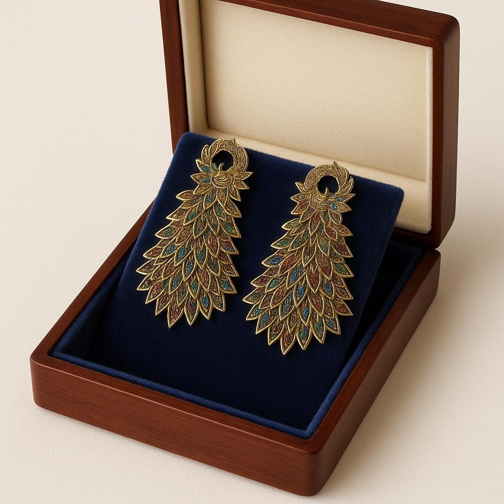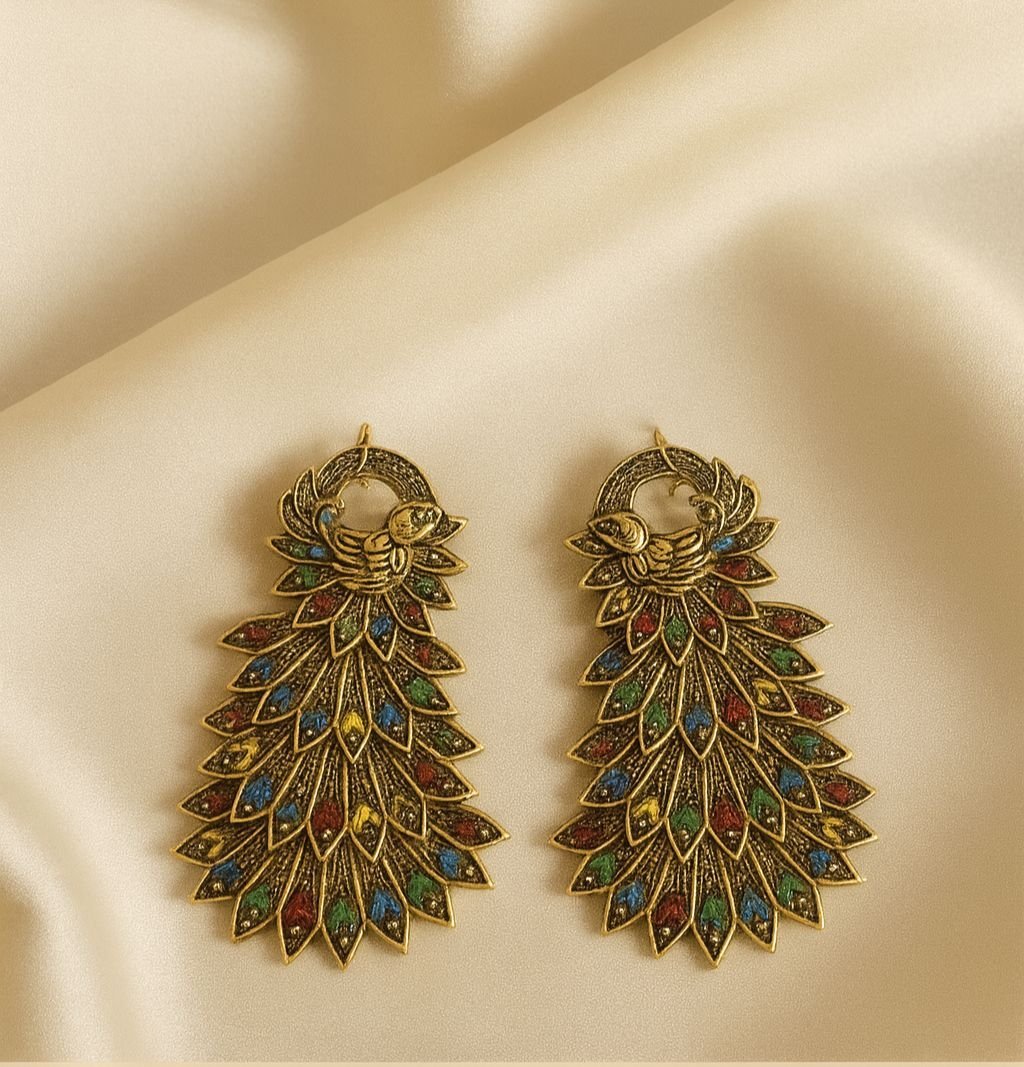 Be the first to review “Gold Plated Peacock Feather Statement Earrings for Women Designer Ethnic Jewelry | Handcrafted Boho Style Party Wear”