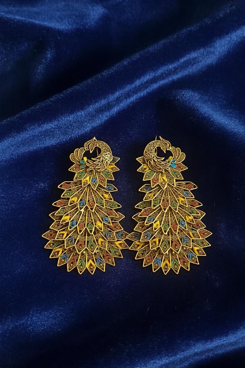 1000077433.jpgGold Plated Peacock Feather Statement Earrings for Women Designer Ethnic Jewelry | Handcrafted Boho Style Party Wear