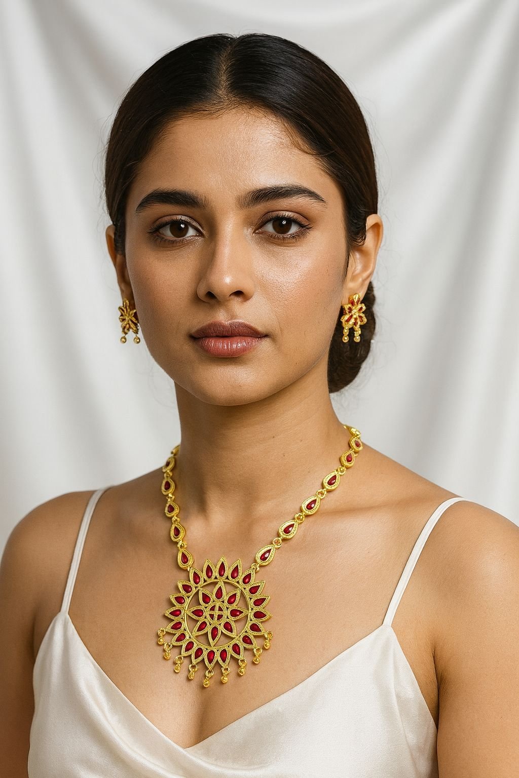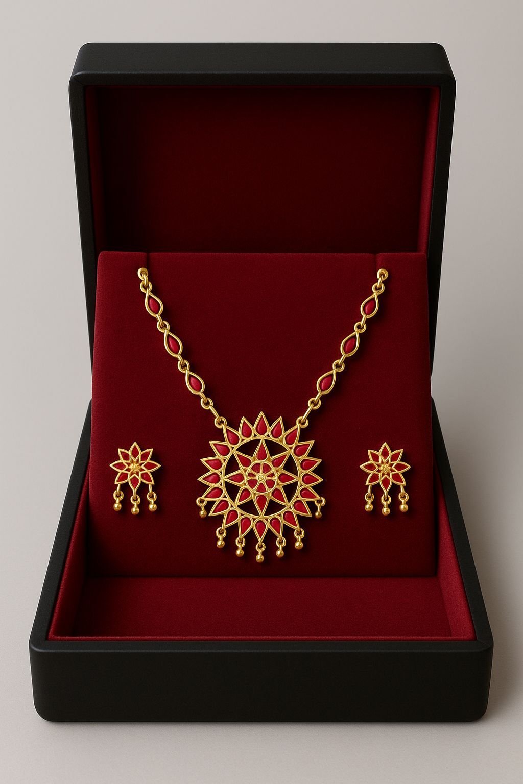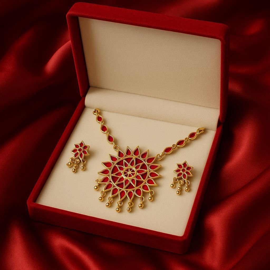 Step into the spotlight with this Gold Plated Red Enamel Necklace Set, a masterpiece that celebrates heritage and modern glamour.