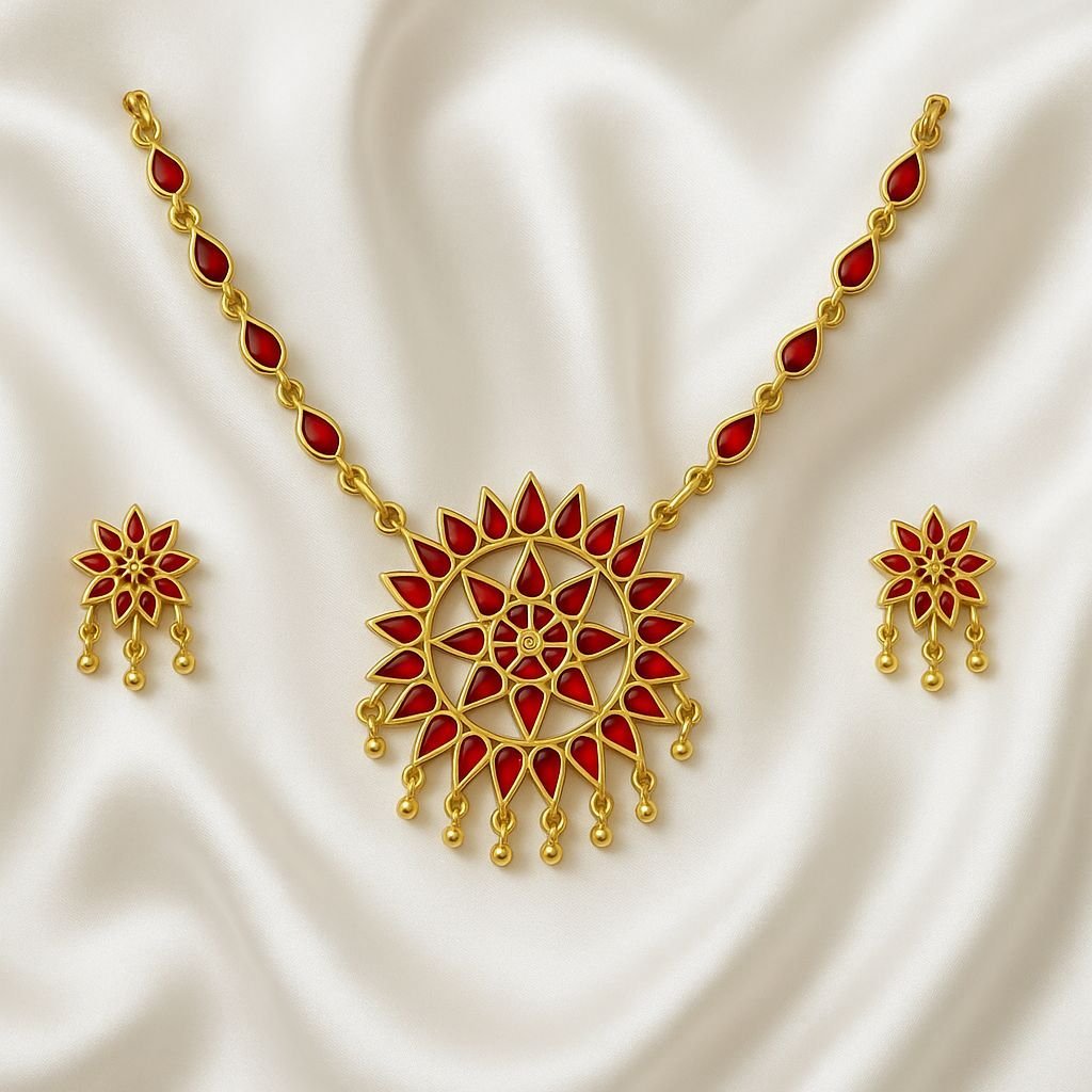 The elaborate sunburst pendant, detailed with red enamel work and gold-tone polish, brings a radiant charm to your ethnic or Indo-western looks.