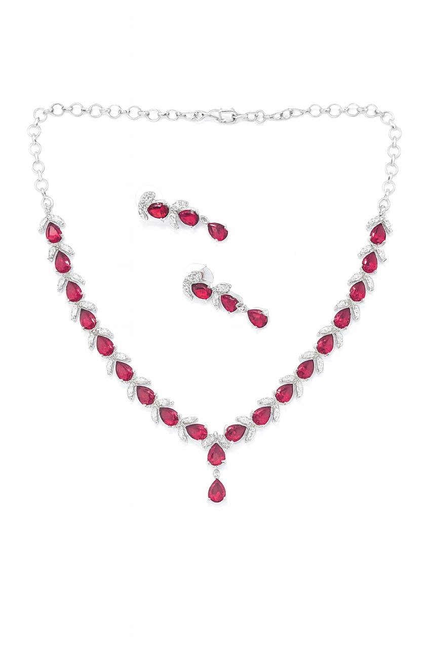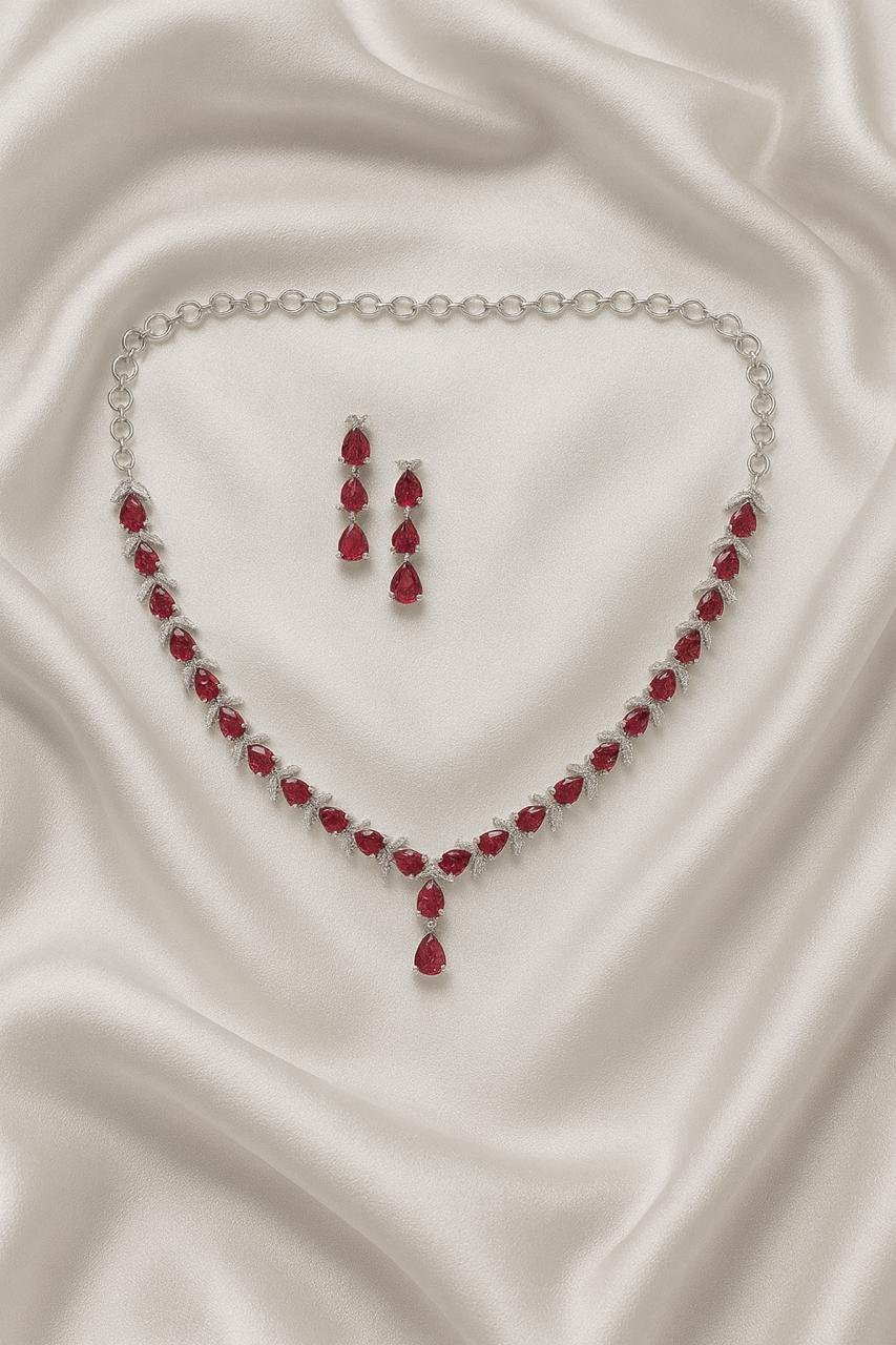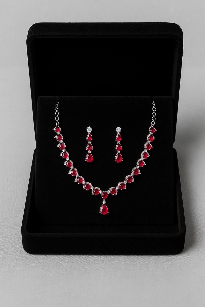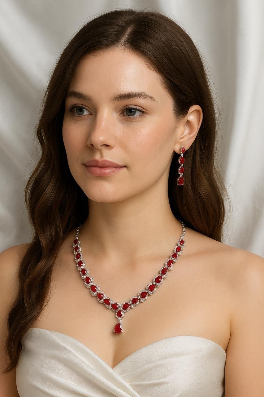 Luxury Ruby Red Necklace Set with Drop Earrings | Elegant Silver-Plated Jewelry for Brides & Special Occasions