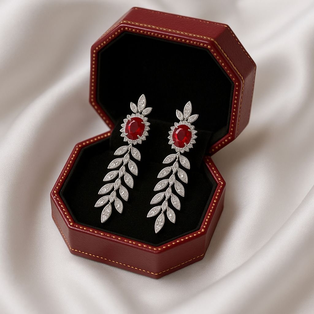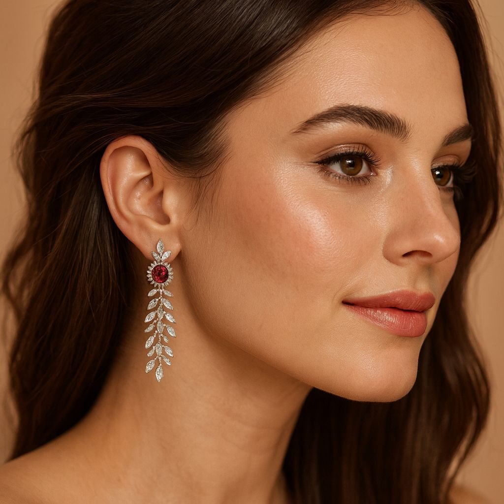 Step into the spotlight with these Red Stone Silver Plated Drop Earrings, designed to embody grace, glamour, and confidence.