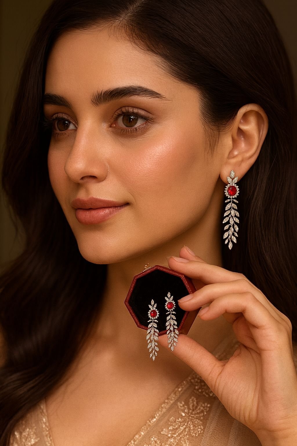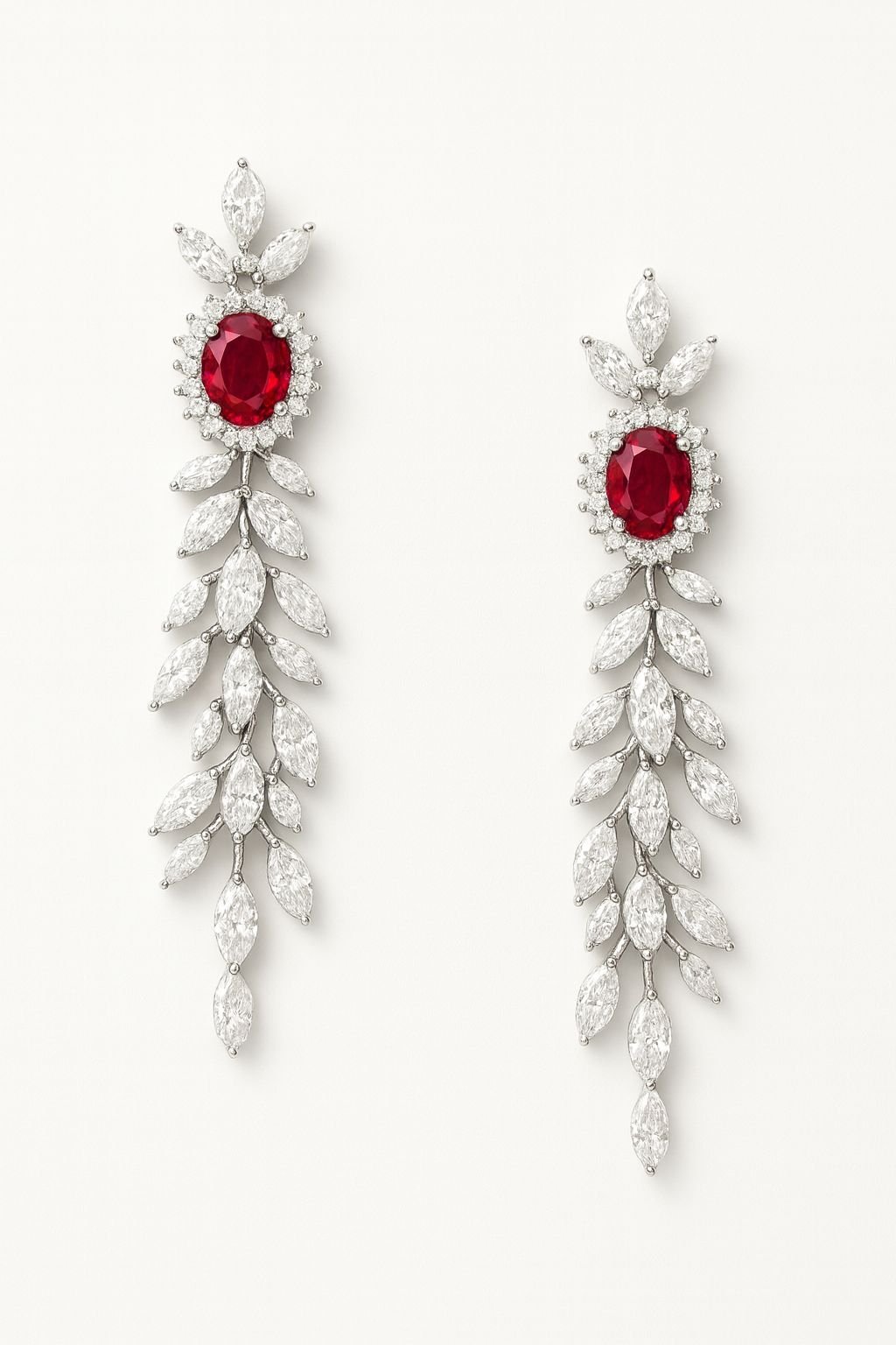 The intricate leaf-inspired CZ diamond pattern flows beautifully from a bold red gemstone centerpiece, creating an elegant and radiant silhouette.