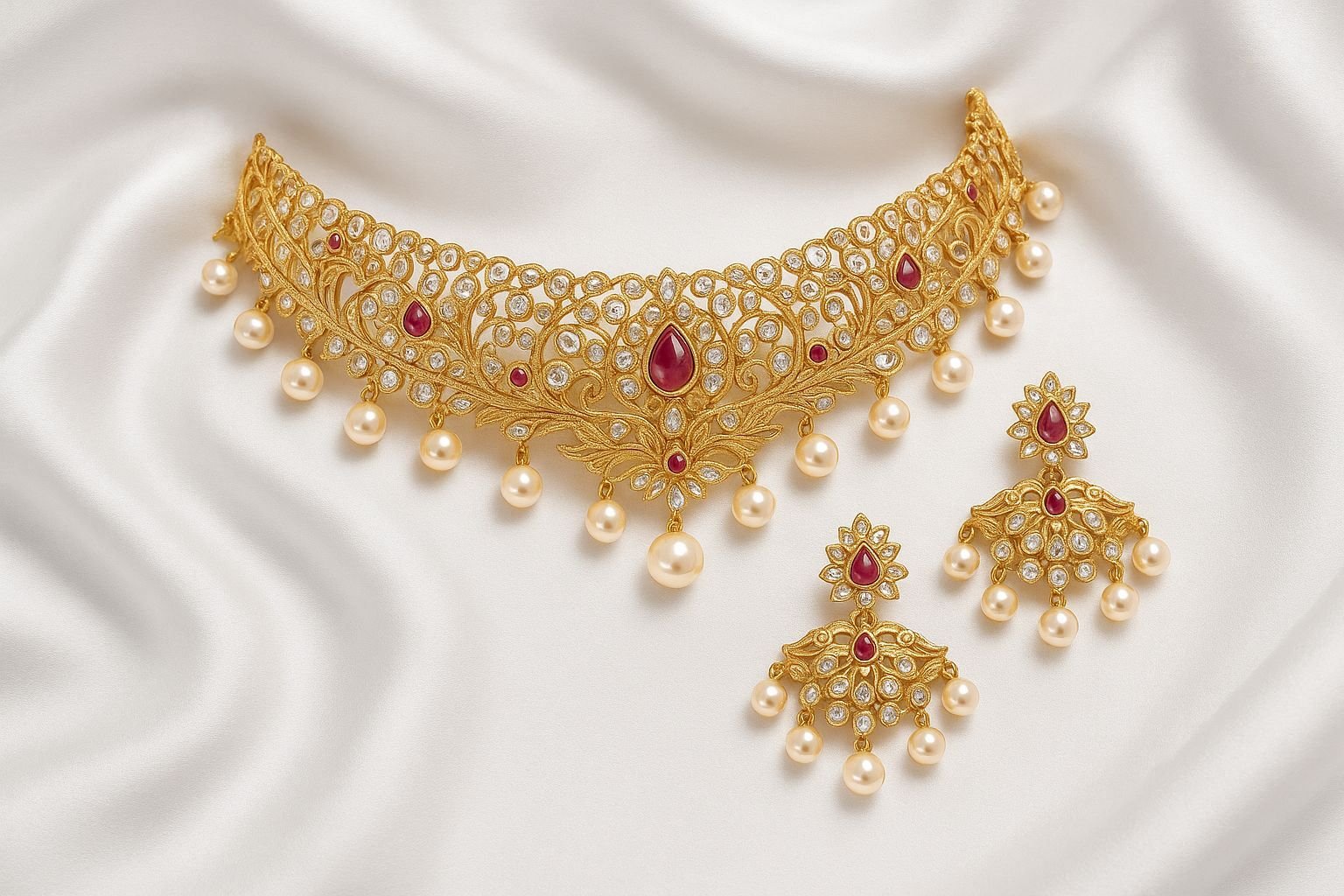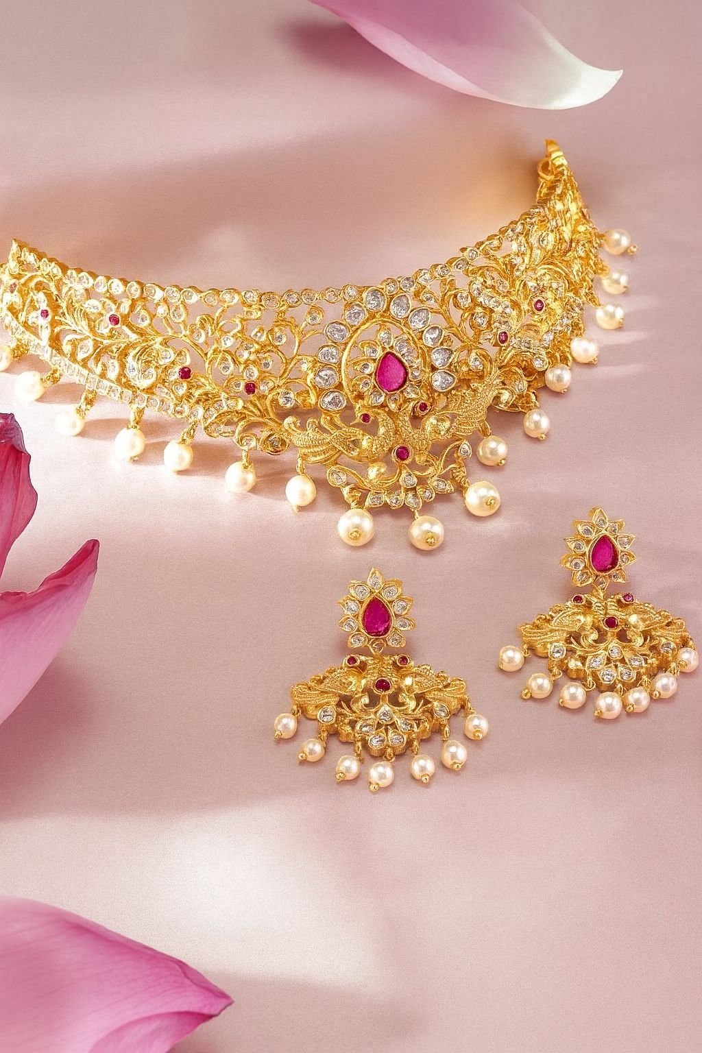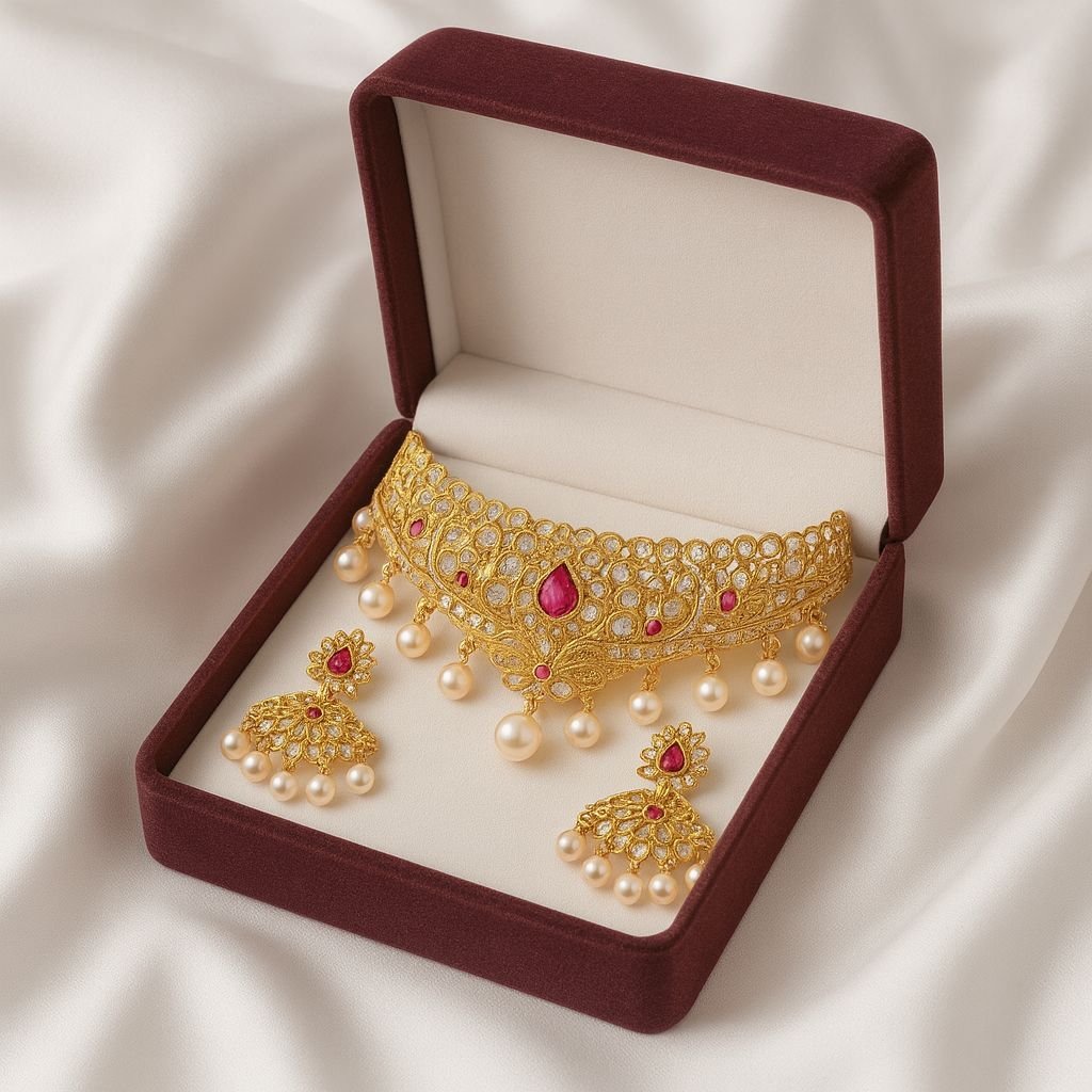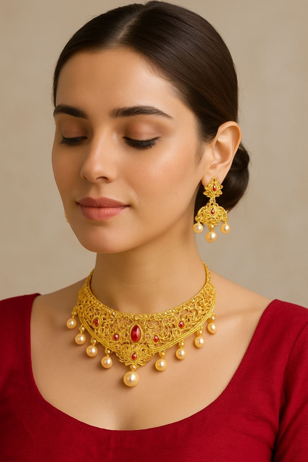 Step into royal elegance with this Gold Plated Pearl and Ruby Choker Necklace Set. Designed to add timeless charm to any look, this intricate jewelry piece beautifully blends traditional Indian craftsmanship with modern luxury.