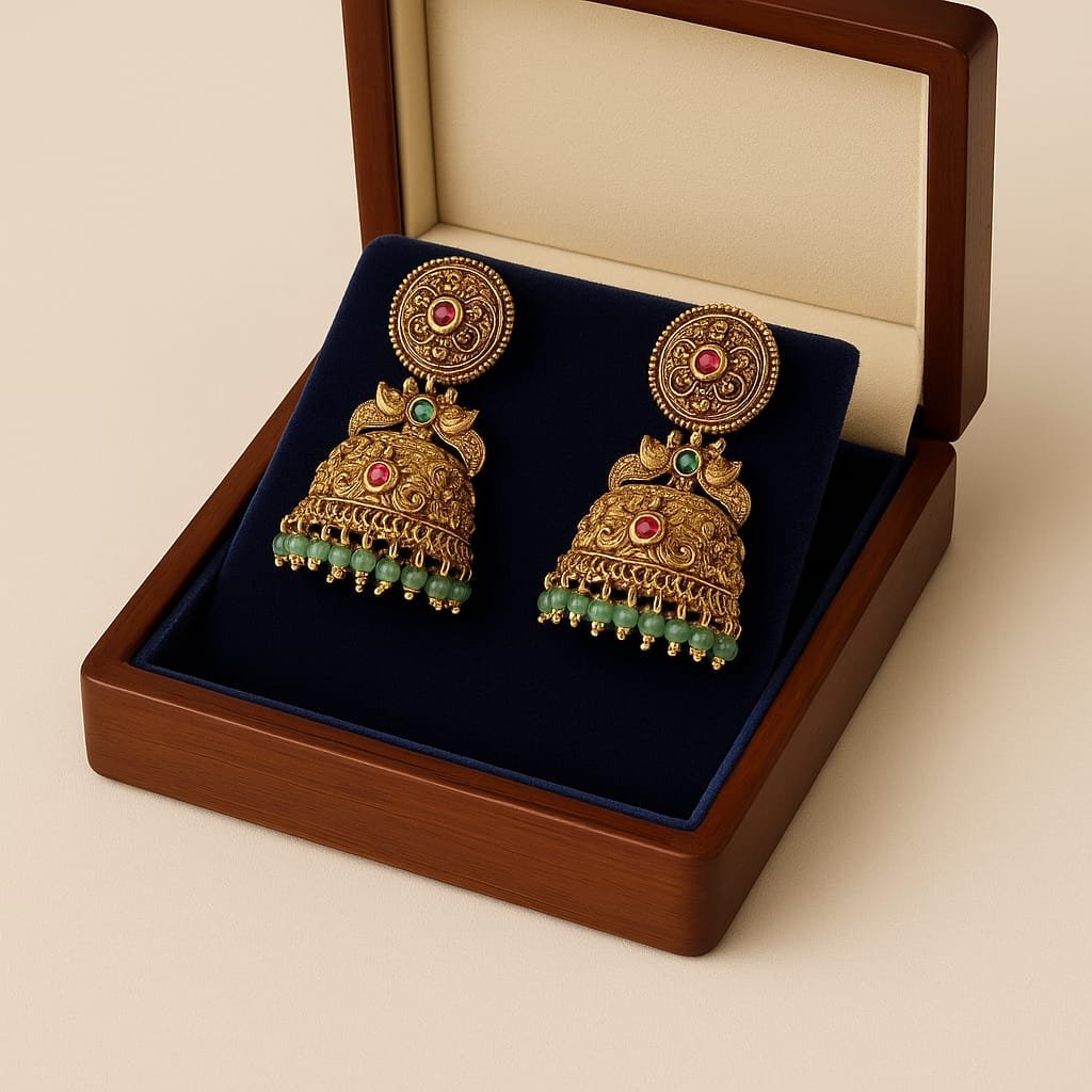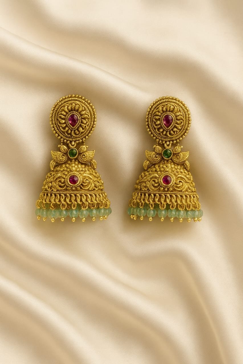 Bring home the heritage of South Indian craftsmanship with these Antique Temple Gold Plated Jhumka Earrings.