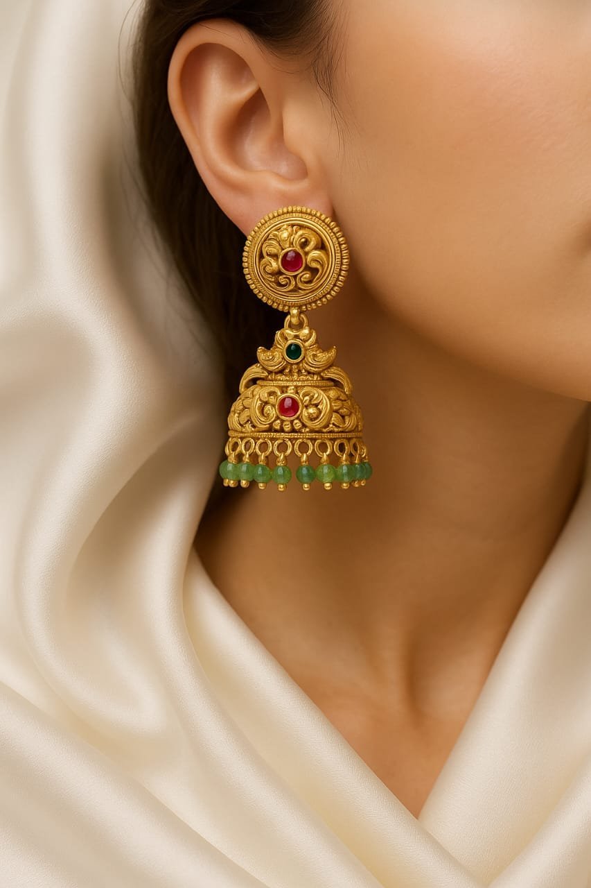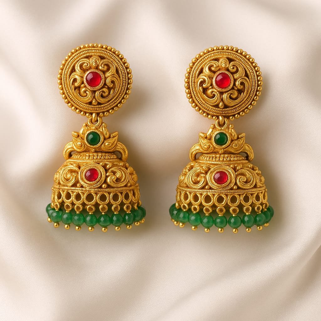 Adorned with traditional motifs, ruby-red and emerald-green stones, and fine bead detailing at the base, these earrings radiate cultural elegance and royal charm.