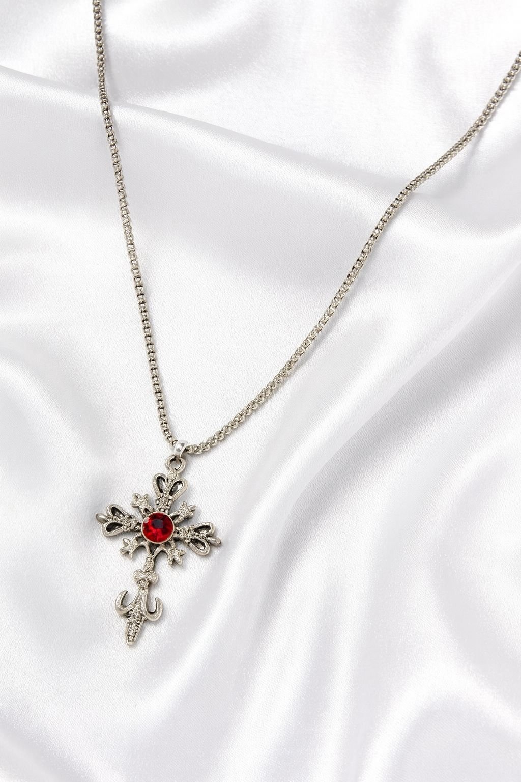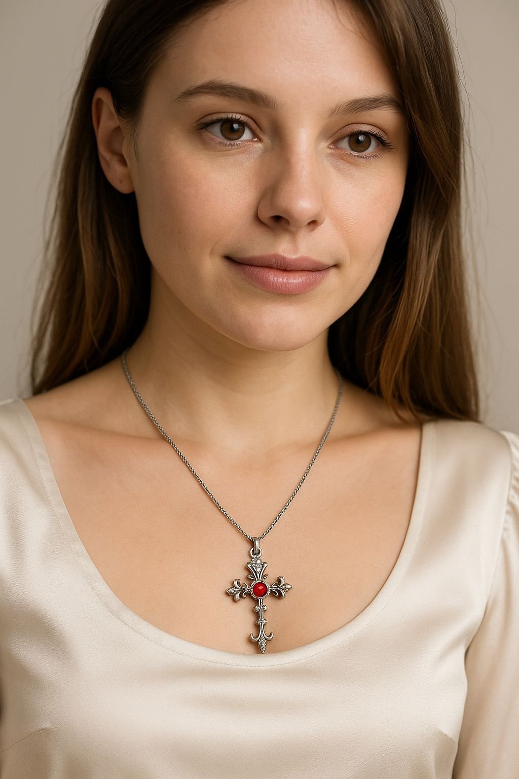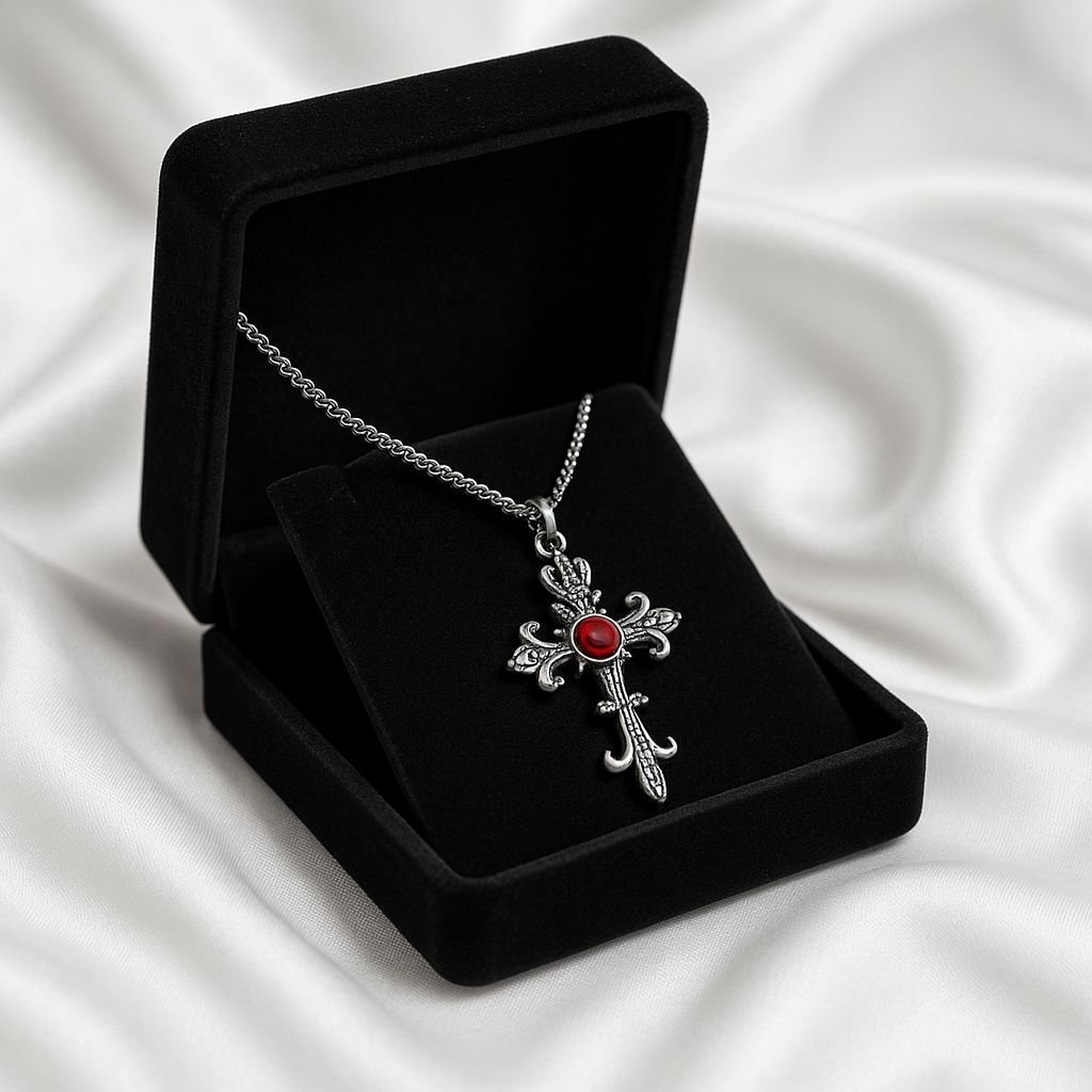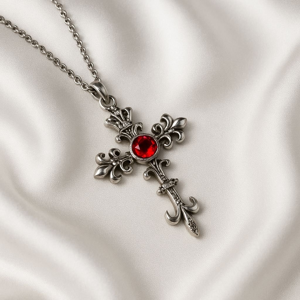 The pendant features an intricate antique-style cross design accented by a deep red gemstone at the center, symbolizing passion, strength, and protection.